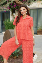 Костюм женский предназначен для повседневной носки. Костюм женский спортивного типа, 2-х предметный джемпер и брюки. Джемпер женский прямого силуэта, длиной до линии бёдер. Перед с 2-мя нагрудными вытачками, с вертикальной планкой по центру из отделочной ткани. Спинка цельнокроенная. Горловина круглая с втачной стойкой из отделочной ткани. Застёжка на втачную металлическую молнию, по центру вертикальной планки переда, переходящую на стойку, низ молнии декорирован настрочной аппликацией. Джемпер со спущенным плечом. Рукав втачной длинный, низ рукава собран на эластичную тесьму; по центру рукава вертикальная притачная планка из отделочной ткани переходящая на плечо. Низ с притачной горизонтальной планкой с кулисой с 2-мя фиксаторами и эластичной тесьмой, регулирующей ширину джемпера по низу. Брюки женские, прямые длинные. Передние половинки с карманами в боковых швах. Задние с притачными вертикальными планками из отделочной ткани. Брюки с притачным поясом, собранным на эластичную тесьму, закреплённую 2-мя отделочными строчками. Длина спинки джемпера 62 см, ширина плеча+длина рукава 72 см. Длина брюк по боковому шву без пояса 104 см, длина брюк по шаговому шву 76,5 см