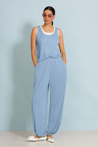 Костюм женский относится к нарядной торжественной одежде. Костюм женский, 2-х предметный, блузка и брюки. Блузка женская, прямого силуэта, свободного кроя, длиной до линии бёдер. Перед и спинка цельнокроенные. Горловина фигурная, обтачная, без воротника. Рукав цельнокроеный, длиной за локоть, с притачной манжетой из отделочной ткани, правый-с подрезом и обтачной бретелью из отделочной ткани с декоротивной тесьмой (цепь). Боковые швы с разрезами. Блузка без плечевых накладок. Брюки женские прямые, длинные. Передние половинки с карманами а боковых швах. Задние половинки с таллиевыми вытачками. Брюки с притачным поясом собранным на эластичную тесьму, закреплённую 2-мя отделочными строчками. Длина брюк по боковому срезу 105 см, длина брюк по шаговому шву 77 см. Длина спинки блузки 65 см, ширина рукава 23 см.