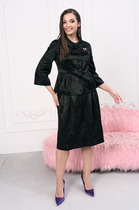 Комплект женский относится к торжественной нарядной одежде. Комплект женский 2-х предметный жакет и платье. Жакет полуприлегающего силуэта с фигурным низом, длиной до линии бёдер. Перед с 2-мя отрезными рельефами и 2-мя настрочными листочками на уровне линии талии. Спинка со средним швом. Горловина с V-образным вырезом с цельнокроеным воротником. Застёжка центральная бортовая на 1-ну петлю и 1-ну пришивную пуговицу. Рукав втачной, 2-х шовный, длиной 3/4, с разрезом внизу локтевого шва. Жакет на приточной подкладке. Жакет с плечевыми накладками. Платье женское полуприлегающего силуэта, длиной до середины икры. Платье отрезное по линии талии. Верхняя часть переда с 2-мя отрезными бочками; нижняя часть переда с 2-мя таллиевыми выточками. Шов соединения частей переда по линии талии декорирован термо тесьмой. Спинка верхняя часть с 2-мя таллиевыми вытачками; нижняя часть спинки с 2-мя таллиевыми вытачками. Боковые швы с разрезами. Горловина круглая обточная без воротника. Застёжка на потайную тесьму-молнию в левом боковом шве платья. Рукав втачной, короткий одношовный. Платье без плечевых накладок. Длина спинки жакета 64 см, длина рукава 45 см. Длина спинки платья 120 см, длина рукава 21 см