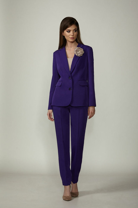 Классический брючный комплект из костюмной ткани на подкладке. Жакет приталенного силуэта с прорезными карманами с клапанами по переду. Воротник-английский, рукава - двухшовные.  Застегивается на две пуговицы.  Брюки слегка заужены к низу, с поясом.  Застегиваются на молнию по переду и  одну пуговицу.  Комплект украшает цветок ручной работы.