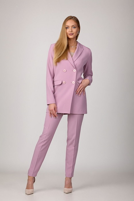 Брючный комплект из костюмной ткани на подкладке. Двубортный жакет выполнен в стиле оверсайз.  Воротник-с отложными лацканами пиджачного типа, рукава - двухшовные. Карманы в боковых швах. Жакет застегивается на две основные пуговицы.  Брюки слегка заужены к низу, с двумя наклонными карманами и притачным поясом.  Застегиваются на молнию по переду и  одну пуговицу.