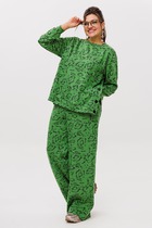 Брючный комплект из костюмной ткани на подкладке. Двубортный жакет выполнен в стиле оверсайз.  Воротник-с отложными лацканами пиджачного типа, рукава - двухшовные. По переду- прорезные карманы  с клапанами. Жакет имеет  два ряда пуговиц, застегивается на две основные пуговицы, одну потайную, остальные пуговицы несут декоративный характер.  Брюки-клеш  с началом расширения от колена. Брюки с двумя карманами округлой формы и поясом-обтачкой.  Застегиваются на молнию по переду и  одну пуговицу.