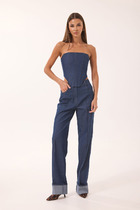 Брючный комплект из костюмной ткани на подкладке. Двубортный жакет выполнен в стиле оверсайз. Воротник-с отложными лацканами пиджачного типа, рукава - двухшовные. По переду- прорезные карманы с клапанами. Жакет имеет два ряда пуговиц, застегивается на две основные пуговицы, одну потайную, остальные пуговицы несут декоративный характер. Брюки-клеш с началом расширения от колена. Брюки с двумя карманами округлой формы и поясом-обтачкой. Застегиваются на молнию по переду и одну пуговицу.