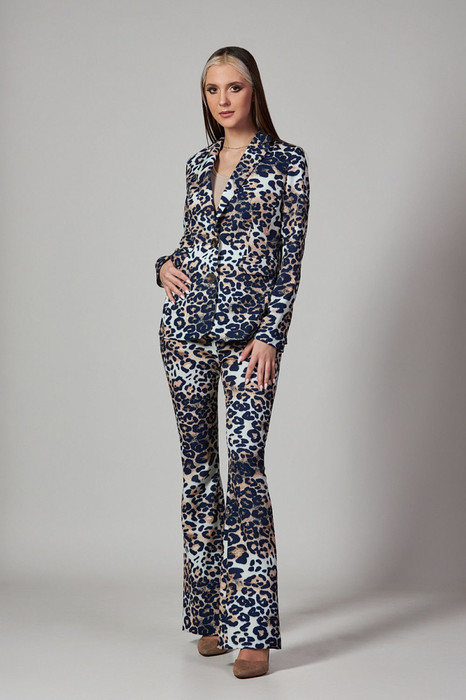 Классический брючный комплект из костюмной ткани на подкладке. Жакет приталенного силуэта с прорезными карманами с клапанами по переду. Воротник-английский, рукава - двухшовные. Брюки-клеш расширены к низу, с началом расширения выше колена 5 см. Брюки с двумя карманами округлой формы и поясом-обтачкой. Застегиваются на молнию по переду и одну пуговицу.