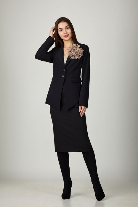 Комплект женский, состоящий из жакета и юбки, выполнен  из стрейчевой  костюмной ткани на подкладке.    Жакет полуприталенного  силуэта с рельефами по переду и спинке, отрезной по линии талии, с баской. Карманы-эмитация. Воротник - пиджачного типа. Рукава - втачные,  двухшовные.  Застежка на 2 пуговицы. Брошь ручной работы в виде цветка хризантемы входит в комплект.  Юбка на подкладке, слегка зауженная к низу, без пояса. Верх юбки обработан обтачкой. Шлица в среднем шве заднего полотнища юбки.  Застежка - молния в среднем шве юбки.