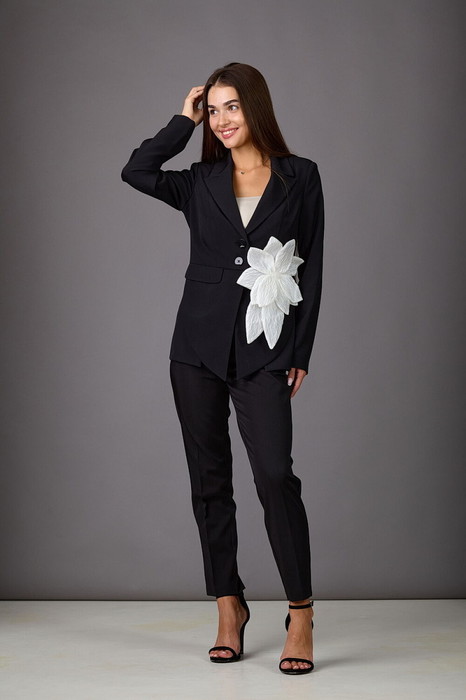 Комплект женский, состоящий из жакета и брюк, выполнен из стрейчевой костюмной ткани на подкладке. Жакет полуприталенного силуэта с рельефами по переду и спинке, отрезной по линии талии, с баской. Карманы-эмитация. Воротник - пиджачного типа. Рукава - втачные, двухшовные. Застежка на 2 пуговицы. Съемная брошь-цветок входит в комплект. Брюки слегка заужены к низу, с поясом. Застегиваются на молнию по переду и одну пуговицу.