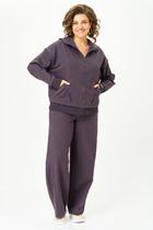 Брючный комплект из костюмной ткани на подкладке. Жакет двубортный. Воротник-с отложными лацканами пиджачного типа, рукава - двухшовные. Карманы прорезные с клапанами. Жакет застегивается на две основные пуговицы, одну потайную. Брюки слегка заужены к низу, с двумя наклонными карманами и притачным поясом. Величина пояса регулируется резинкой. Застегиваются на молнию по переду и одну пуговицу.