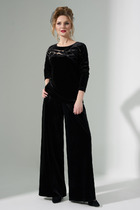 Брючный комплект из костюмной ткани на подкладке. Жакет двубортный. Воротник-с отложными лацканами пиджачного типа, рукава - двухшовные. Карманы прорезные с клапанами. Жакет застегивается на две основные пуговицы, одну потайную. Брюки слегка заужены к низу, с двумя наклонными карманами и притачным поясом. Величина пояса регулируется резинкой. Застегиваются на молнию по переду и одну пуговицу.