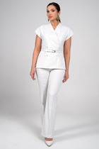 Комплект из костюмной ткани на подкладке, состоящий из жакета и брюк. Жакет приталенного силуэта с прорезными карманами с клапанами по переду. Воротник-английский, рукава - двухшовные. Застегивается на две пуговицы.  Брюки прямого силуэта с наклонными карманами и поясом. Величина пояса регулируется резинкой. Застегиваются на молнию  пуговицу по переду.