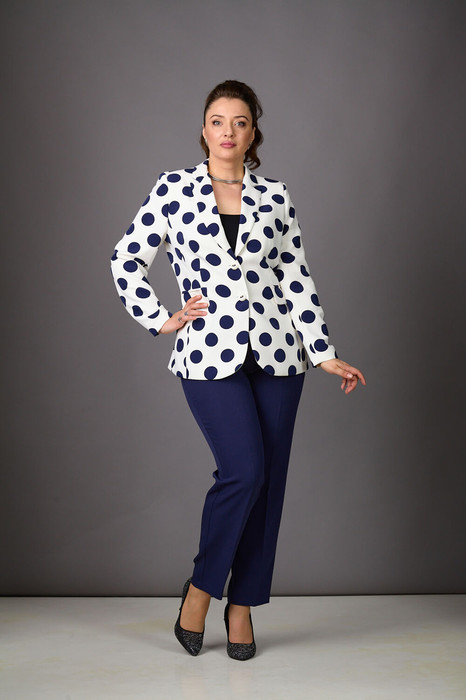 Эффектность и современный шик  - горохи снова в тренде! Комплект из стрейчевой костюмной ткани на подкладке, состоящий из жакета и брюк. Жакет приталенного силуэта с карманами с клапанами по переду. Воротник с лацканами пиджачного типа, рукава - втачные, длинные. Застежка на пуговицы. Брюки со средней посадкой, зауженные к низу, с карманами и  регулируемым резинкой поясом. Застегиваются на молнию и пуговицу.