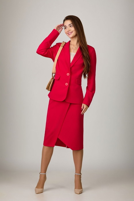 Комплект из костюмной ткани на подкладке, состоящий из жакета и юбки. Жакет приталенного силуэта с прорезными карманами с клапанами по переду. Воротник-английский, рукава - двухшовные. Кант по краю борта, клапанам. Застегивается на две пуговицы. Юбка на подкладке, слегка зауженная к низу, с отлетной деталью и поясом-обтачкой. Молния, шлица в среднем шве заднего полотнища юбки.