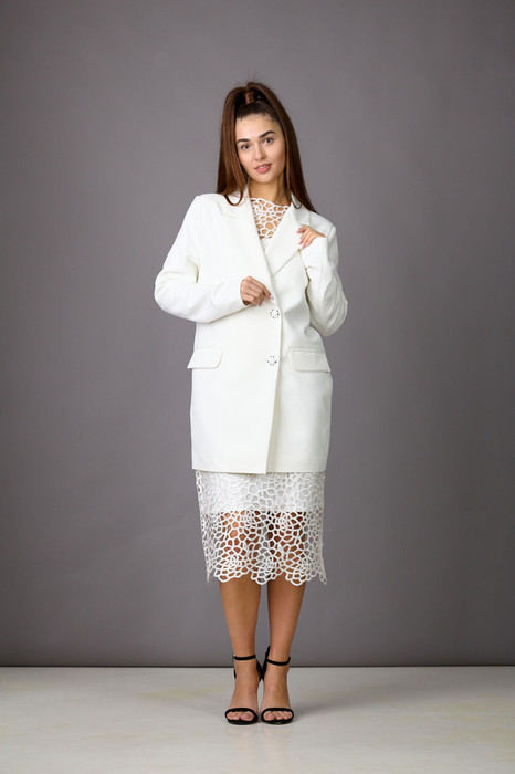 Двубортный жакет из костюмной ткани на подкладке. Воротник-с отложными лацканами пиджачного типа, рукава – двухшовные. По переду - прорезные карманы с клапанами. Застегивается на 2 пуговицы и одну потайную.