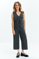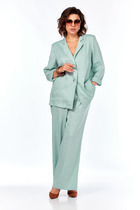 Классический брючный комплект из костюмной ткани на подкладке. Жакет приталенного силуэта с прорезными карманами с клапанами по переду. Воротник-английский, рукава - двухшовные. Кант по краю борта, клапанам   добавит  стиля и элегантности. Застегивается на две пуговицы.  Брюки прямые со складкой, широким поясом-обтачкой, наклонными карманами. Застегиваются на молнию по переду  и пуговицу.