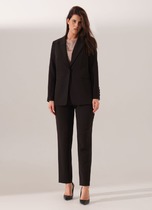 Комплект-двойка, состоящий из пиджака и юбки.  Пиджак из костюмной ткани на подкладке с расширенной линией плеч, с отрезными бочками по переду и спинке и вытачками по переду. Воротник-с отложными лацканами пиджачного типа. По переду - прорезные  карманы  с клапанами. Рукава длинные, двухшовные. Пиджак  застегивается на три пуговицы. Юбка - миди с наклонными карманами и складкой по переду, с широким поясом-обтачкой. Застегиваются на молнию спереди и пуговицу.