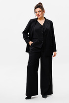 Брючный комплект из костюмной ткани на подкладке. Двубортный жакет полуприталенного силуэта с отрезными бочками и вытачками по переду и спинке. Воротник-с отложными лацканами пиджачного типа. По переду - прорезные  карманы  с клапанами. Рукава длинные, двухшовные. Жакет застегивается на две пуговицы. Жакет декорирован цветами-брошами ручной работы. Брюки узкие, с двумя карманами и поясом-обтачкой.  Застегиваются на молнию по переду и  одну пуговицу.