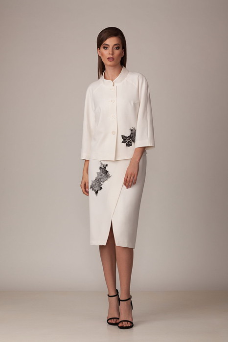 Комплект из костюмно-плательной ткани на подкладке, состоящий из жакета и юбки. Жакет прямого силуэта с двумя нагрудными вытачками. Воротник - стойка. Рукав трехчетвертной. Жакет застегивается на 4 пуговицы. Юбка на запах, слегка зауженная к низу, с поясом. Настрочные аппликации в нижних частях жакета и юбки придают особый шик. Юбка застегивается на 2 пуговицы. Длина жакета 58см, длина рукава 58см (с плечом). Длина юбки 71 см.