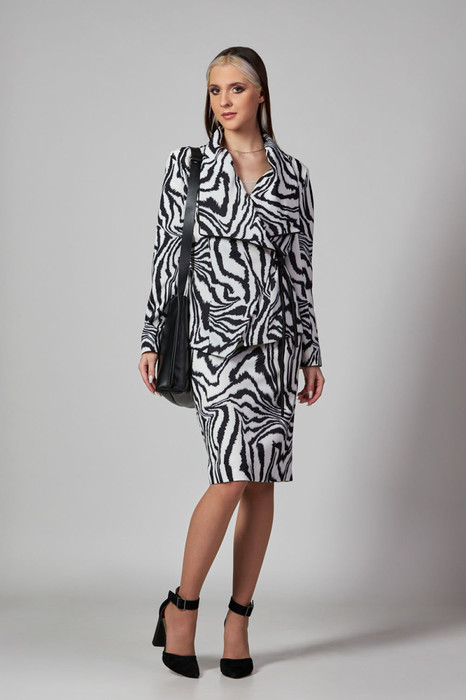 Роскошный комплект из стрейчевой костюмной  ткани на подкладке, состоящий из жакета и юбки.  Двубортный  жакет с рельефами по переду, с завязками из атласа  и потайной застежкой, с помощью которых можно легко регулировать ширину. Воротник - апаш. Рукава - длинные, двухшовные. Юбка на подкладке, слегка зауженная к низу, без пояса. Верх юбки обработан обтачкой. Шлица в среднем шве заднего полотнища юбки обеспечит свободу движения. Застежка - молния в среднем шве юбки.
