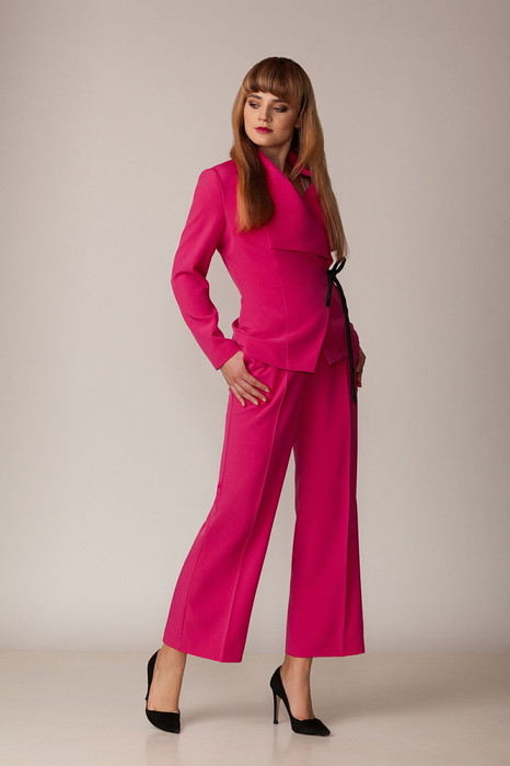 Роскошный комплект из стрейчевой костюмной  ткани на подкладке, состоящий из жакета и брюк.  Двубортный  жакет с рельефами по переду, с завязками из атласа  и потайной застежкой, с помощью которых можно легко регулировать ширину. Воротник - апаш. Рукава - длинные, двухшовные. Брюки прямые с широким поясом-обтачкой, наклонными карманами и  молнией по переду.