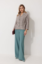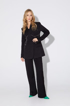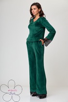 Брючный комплект из костюмной ткани на подкладке. Жакет прямого силуэта с двумя наклонными вытачками и двумя прорезными карманами с листочками. Рукава - длинные, двухшовные. Жакет застегивается на 1 пуговицу. Брюки прямые с широким поясом-обтачкой, наклонными карманами и молнией по переду.