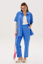 Брюки женские из трикотажной ткани ,с легка заужены к низу. По переду брюк расположены накладные карманы. В пояс вставлена резинка по кругу.