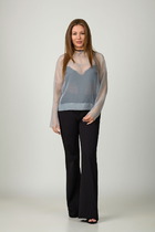 Джемпер классического кроя. На спинке расположена функциональная молния, по переду — съемный декор. Силуэт костюма прилегающий.