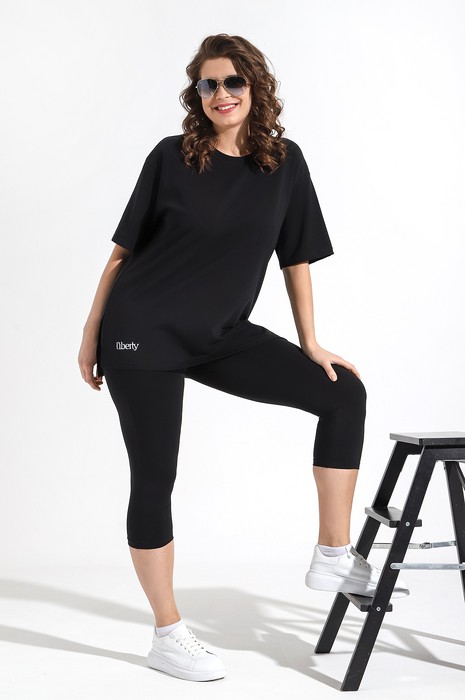 Костюм женский из трикотажного гладкокрашенного полотна «кулирка с лайкрой», состоящий из футболки и бридж. Футболка свободного покроя, со спущенным плечом и втачными рукавами длиной до локтя, горловиной овальной формы, обработанной втачной планкой и принтом на полочке, выполненным в технике «шелкографии». В нижней части боковых швов – разрезы.Бриджи – классического покроя, на резинке.