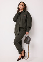 Жакет прямого кроя с втачным рукавом. Линия плеча слегка спущена. Застежка в виде завязок придает образу игривость и женственность. По горловине отложной воротник. Рукав длиной 3/4 заканчивающейся притачной манжетой с разрезом. В боковых швах разрезы.
