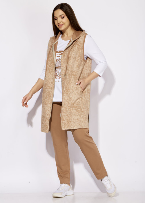 Жилет прямого силуэта. По переду карманы в фигурных рельефах. По спинке подрезные детали с декоративной нашивкой. Горловина оформлена капюшоном с кулисой. По бокам разрезы.