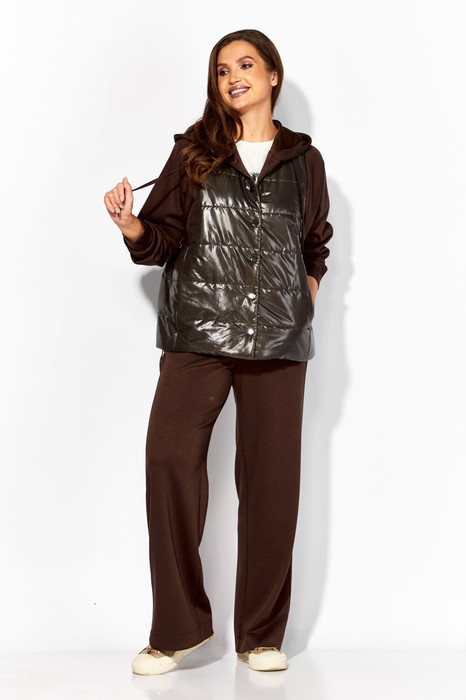 Куртка прямого силуэта. Выполнена на сочетании стеганной плащевки на синтепоне (VS 100) и трикотажного полотна (фенди) Центральная часть переда и спинки из стежки. По переду центральная застежка на кнопки и карманы в рельефах. Горловина оформлена капюшоном с кулисой по краю. Рукав цельнокройный, с манжетой снизу. Низ куртки по ширине регулируется внутренней кулисой (резинка) с фиксаторами. Стежка на подкладке.