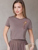 Комплект женский, 2х предметный, состоящий из джемпера и брюк, в сочетании двух видов трикотажного полотна. Джемпер прямого силуэта, с рукавом длинной 3/4. Рукав со спущенной линией плеча. По низу отрезная манжета. Горловина круглой формы, с широкой подрезной бейкой. По низу переда отрезная планка. Перед задекорирован принтом. Манжеты рукавов, бейка горловины и планка низа из отделочного трикотажного полотна. Спинка без особенностей. Брюки прямые. По переду наклонные карманы. Пояс притачной с резинкой и кулисой.