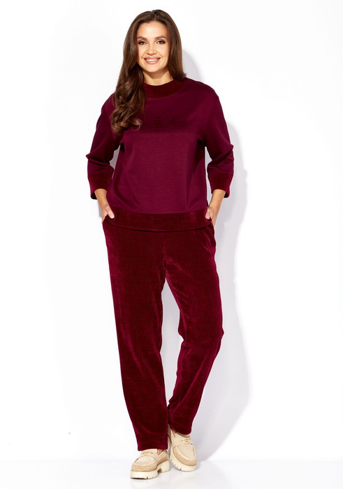 Комплект женский, 2х предметный, состоящий из джемпера и брюк, в сочетании двух видов трикотажного полотна. Джемпер прямого силуэта, с рукавом длинной 3/4. Рукав со спущенной линией плеча. По низу отрезная манжета. Горловина круглой формы, с широкой подрезной бейкой. По низу переда отрезная планка. Перед задекорирован принтом. Манжеты рукавов, бейка горловины и планка низа из отделочного трикотажного полотна. Спинка без особенностей. Брюки прямые. По переду наклонные карманы. Пояс притачной с резинкой и кулисой.