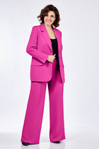Жакет полуприлегающего силуэта с центральной застёжкой на планку(6 петель и пуговиц). На переде обработаны кокетки, нагрудные вытачки, рельефные швы, карманы с листочками в швах, накладные карманы. Спинка с кокеткой, средним швом, рельефными швами. Рукав втачной, двухшовный, с разрезом в локтевом шве, по низу с заложенной складкой и манжетой на пуговице. Воротник стояче-отложной с отрезной стойкой.