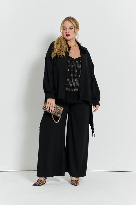 Прямые, широкие брюки с карманами спереди и на поясе с резинкой.