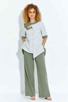 три декоративные пуговицы.Брюки — из полотна с набивным рисунком, свободные, на притачном поясе