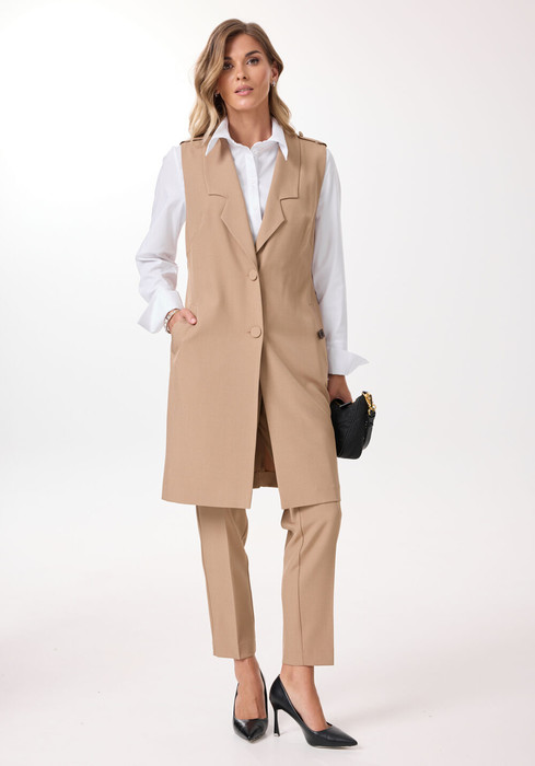 Комплект состоит из удлиненного жилета, брюк и рубашки. Жилет без подкладки прямого силуэта с центральной бортовой застежкой на две петли-пуговицы, длиной ниже колена. Спинка с талиевыми вытачками, поясом и шлицей. Брюки классической формы, слегка заужены к низу, со стрелками по передним и задним половинкам. Верхний срез обработан притачным поясом, по спинке вставлена резинка для регулировки обхвата талии. По центру переда - застёжка на крючок и тесьму-молнию. Рубашка полуприлегающего силуэта с застёжкой на петли и декоративные пуговицы. Воротник стояче-отложной. По боковым швам блузы обработаны разрезы. Рукав длинный втачной, с высокой притачной манжетой, которая застёгивается на петлю и пуговицу.