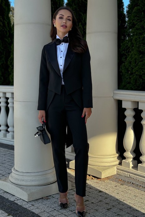 Костюм женский трёхпредметный, состоящий из фрака, блузы и брюк. В комплекте к костюму идёт галстук-бабочка.