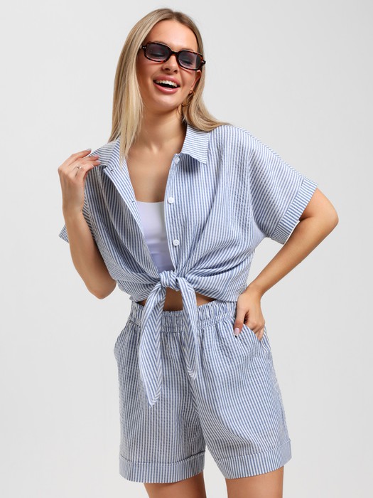 Костюм молодежный из тканого полотна в полоску, состоящий из блузы - рубашки и шорт. Блуза – укороченного силуэта, свободного покроя, с короткими цельнокроеными рукавами, обработанными манжетами, акцентными декоративными завязками спереди, отложным воротником и центральной бортовой застежкой на петли и пуговицы.Шорты - свободные, средней длины, с карманами в боковых швах, на притачном поясе с эластичной тесьмой внутри, с двойной подгибкой низа имитирующей манжет.