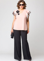 Брюки расширенные к низу на резинке. По низу изделия настрочены отделочная тесьма.