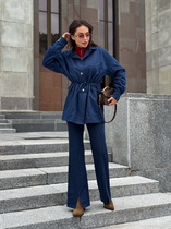 Костюм женский двухпредметный, состоящий из жакета и юбки. Жакет полуприлегающего силуэта с центральной бортовой застежкой на 5 петель-пуговиц. По переду обработаны нагрудные вытачки и по 3 защипа-складки по талии. Спинка со средним швом и двумя защипами-складками с двух сторон. Горловина V-образной формы, с цельнокроенной стойкой и с отрезным швом по спинке. Рукав втачной двухшовный длинный. Юбка заужена к низу, длиной за колено. Переднее полотнище с талиевыми вытачками. Заднее полотнище со средним швом, заканчивающимся шлицей, и с застежкой на потайную тесьму-молнию. Заднее полотнище также с талиевыми вытачками по 2 шт.