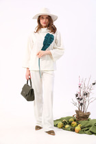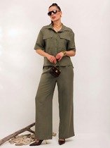 Костюм женский двухпредметный, состоящий из жакета и брюк. Жакет полуприлегающего силуэта, удлиненный, с центральной бортовой застежкой на 2 петли-пуговицы до линии перегиба лацкана. Перед с нагрудными вытачками, выходящими из горловины. Боковые швы с разрезами, между которыми по спинке вставлен пояс фигурной формы с декоратичной нашивкой. Спинка со средним швом. Воротник пиджачного типа. Рукава втачные двухшовные длиной 3/4. Брюки палаццо с притачным широким поясом на резинке от заутюженных стрелок по передней половинке вкруговую. Застежка на тесьму-молнию в средних срезах передних половинок брюк и 2 петли-пуговицы по поясу.