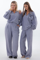 Стильный брючный костюм — сочетание аккуратной классики и модных деталей. Туника прямого силуэта с передом, имитирующим запах, и съемным цветком-брошью создаёт утончённый и интересный акцент. Рукав 3/4 прямого кроя с отложной манжетой из отделочной ткани, овальная горловина — удобно и стильно. У брюк проходит декоративный лампас из отделочной ткани; брюки заужены к низу, подчёркивают силуэт и подходят для разных типов фигуры.