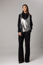 Костюм женский 3-х предметный, полуприлегающего силуэта. Состоит из жакета и жилета на подкладке и брюк. Жакет с воротником пиджачного типа, центральной застёжкой на 1 петлю и 1 пуговицу. Перед с рельефными швами от пройм до низа и талиевыми вытачками и прорезными карманами с листочками с втачными концами. Спинка со средним швом. Рукав втачной, двухшовный, длинный со шлицей. Жилет с рельефными швами от пройм до низа по переду и спинке, с центральной застёжкой на 4 петли и 4 пуговицы. Перед с прорезными карманами с листочками с втачными концами. Брюки с застёжкой на тесьму "молнию" в средних срезах передних половинок, с притачным поясом на 1 петлю и 1 пуговицу и резинкой по задним половинкам, с карманами наклонными к боковым швам. По передним и задним половинкам заутюженные канты. Длина жакета по спинке - 70 см. Длина рукава - 61 см. Длина жилета по спинке - 53 см. Длина брюк по боковому шву - 101 см.
