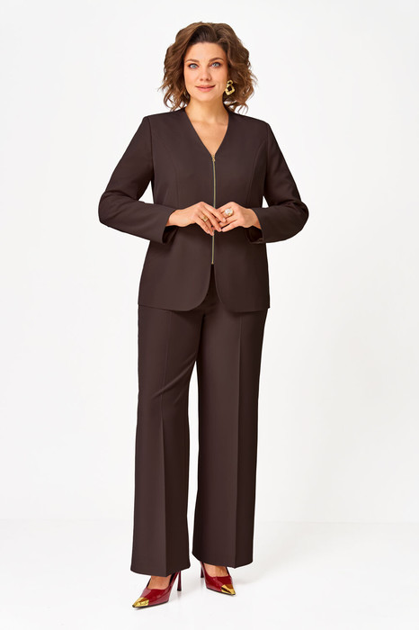 Костюм женский двухпредметный, состоящий из жакета и брюк. Жакет полуприлегающего силуэта с центральной бортовой застежкой на тесьму-молнию, с фигурными бочками. Спинка со средним швом. Вырез горловины V-образной формы. Рукава втачные длинные двухшовные. Брюки-палацо с притачным поясом, сзади на резинке. Застежка на тесьму-молнию в средних срезах передних половинок брюк и 1 петлю-пуговицу. В изделии обработаны карманы, наклонные к боковому шву. На брюках заутюжены стрелки.