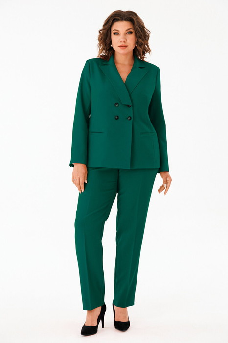 Костюм женский двухпредметный, состоящий из жакета и брюк. Жакет полуприлегающего силуэта со смещённой бортовой застёжкой на две горизонтальные обмётанные петли и две пуговицы и одну потайную. На правой части переда две отделочные пуговицы. Лацкан отложной фантазийной формы. Детали переда с отрезными бочками, талиевыми вытачками и карманами в рамку. Спинка со средним швом. Воротник отлажной пиджачного типа. Рукава втачные двухшовные с тремя петлями-пуговицами. Брюки классического силуэта с притачным поясом на резинке по задним половинкам брюк и с застёжкой на тесьму-молнию в средних срезах передних половинок и одной петлёй пуговицей по поясу. Брюки с наклонными к боковому шву карманами и отделочными хлестиками фигурной формы с одной петлёй пуговицей по поясу. На брюках заутюжены канты. Брюки слегка заужены к низу. По краю воротника, борта, лацкана, хлестика проложена отделочная строчка на 0,5 см. Длина жакета по спинке - 65 см. Длина рукава - 61 см. Длина брюк по боковому шву - 100 см.