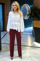 Брюки зауженные к низу, с центральной застёжкой на молнию и петлю-пуговицу.