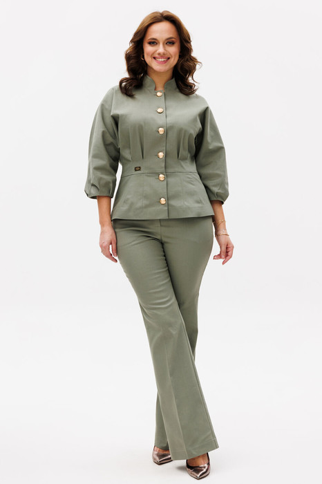 Жакет приталенного  силуэта на подкладке из 100% хлопка. Перед с центральной бортовой застежкой на петли-пуговицы. Перед и спинка отрезные по линии талии со встречными складками выходящими из подреза. На басках обработаны талиевые вытачки. Рукав цельнокроеный типа "летучая мышь" длиной 3/4 с односторонними кладками. Воротник стойка.