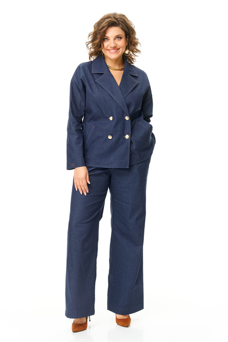 Жакет прямого свободного покроя со спущенной линией плеча. Застежка двубортная на золотые пуговицы. Воротник отложной пиджачного типа.