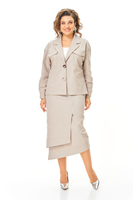 Жакет прямого свободного покроя со спущенной линией плеча. Застежка однобортная на авторские металлические пуговицы сложной формы. Воротник отложной пиджачного типа. Рукав длинный со складками и манжетой, застежка на петлю-пуговицу. По переду обработаны нагрудные карманы с клапаном. Спинка со средним швом.