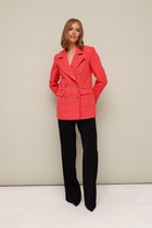 Блуза прямого свободного покроя. Рукав 3/4 типа "летучая мышь". Низ рукава со складками и отрезной манжетой с застежкой на петлю-пуговицу. По переду обработана кулиса, с втянутым шнуром с фиксатором и наконечниками. Низ переда ассиметричной формы с углом. Горловина округлой формы, окантована.