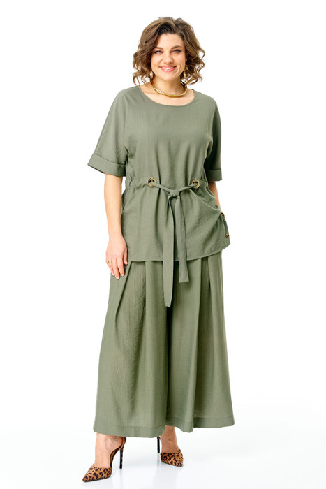 Блуза прямого свободного покроя. Рукав короткий типа "летучая мышь" с отложной манжетой. По переду пробиты увеличенные люверсы. По переду и спинке обработана кулиса с втянутым поясом. Горловина округлой формы, окантована. В боковых швах обработаны разрезы. По переду, снизу, пришита декоративная нашивка авторской формы.